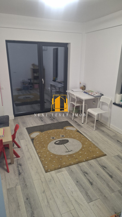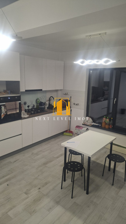 Bucătărie generoasă, complet mobilată și utilată, cu ieșire pe balcon, baie modernă și o cameră foarte spațioasă, ideală pentru birou, sală de activități sau recepție.