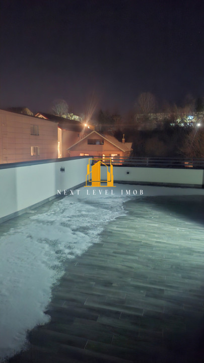 Baie, o cameră și acces către o terasă superbă, extrem de spațioasă, cu vedere panoramică deosebită, perfectă pentru momente de relaxare sau evenimente private.